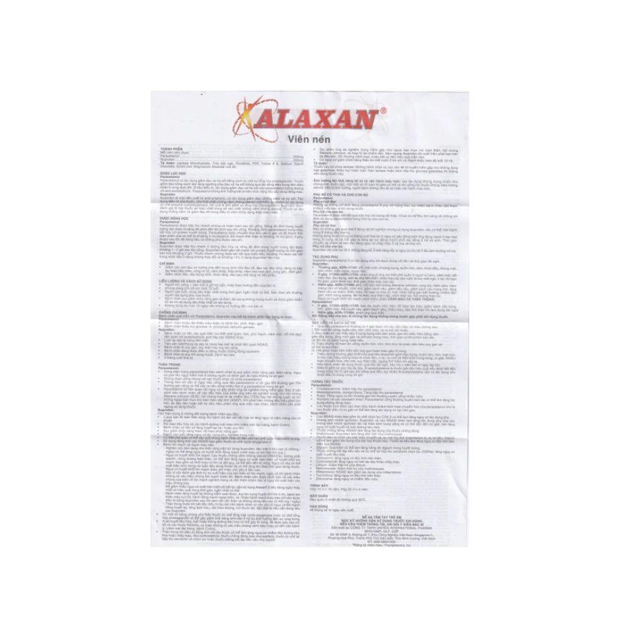 Thuốc Alaxan 325 mg là thuốc giảm đau – hạ sốt – chống viêm chứa thành phần chính là Paracetamol 325 mg. Thuốc được sử dụng để giảm đau nhẹ và vừa như đau đầu, đau răng, đau cơ, đau khớp, đau lưng, đau do viêm, đau do chuột rút, đồng thời giảm sốt trong các trường hợp cảm cúm, sốt do bệnh lý khác. Paracetamol là chất giảm đau được sử dụng phổ biến, tác dụng trực tiếp lên trung tâm điều nhiệt và trung tâm giảm đau của não.
