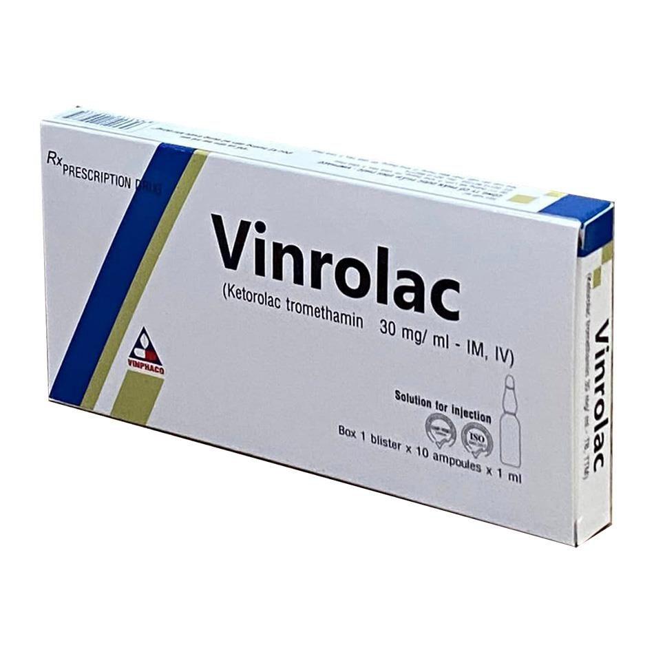 Vinrolac 30mg/ml là thuốc tiêm giảm đau thuộc nhóm chống viêm không steroid (NSAIDs), chứa hoạt chất Ketorolac tromethamine. Thuốc có tác dụng giảm đau mạnh, thường dùng ngắn hạn trong các trường hợp đau vừa đến nặng sau phẫu thuật hoặc chấn thương.