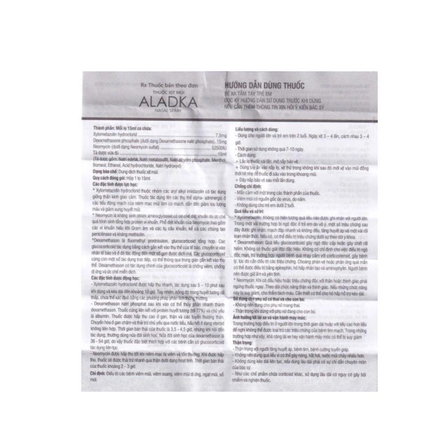 Thuốc Aladka Nasal Spray 15 ml là thuốc xịt mũi chứa các thành phần chính gồm Xylometazoline, Dexamethasone phosphate và Neomycin. Thuốc có tác dụng co mạch giúp giảm nghẹt mũi nhanh chóng, kết hợp kháng viêm và kháng khuẩn tại chỗ. Aladka Nasal Spray được sử dụng trong điều trị viêm mũi, viêm xoang, viêm mũi dị ứng, ngạt mũi, sổ mũi, giúp thông thoáng đường thở và cải thiện các triệu chứng khó chịu ở mũi.