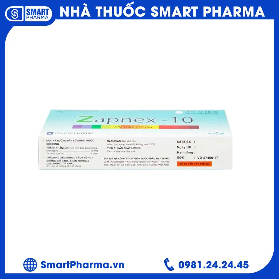 Zapnex được sản xuất bởi Công ty Cổ Phần Dược phẩm Đạt Vi Phú – Davipharm, Việt Nam. Thuốc Zapnex có hoạt chất chính là Olanzapin, là thuốc điều trị tấn công và điều trị duy trì bệnh tâm thần phân liệt, cũng như các bệnh loạn thần khác. Với tác dụng hiệu quả của thuốc sẽ giúp hỗ trợ tích cực trong việc điều trị, giúp đem lại niềm vui cho bệnh nhân, sớm giúp họ khỏi bệnh và trở lại lao động, làm việc trở lại như thường ngày…