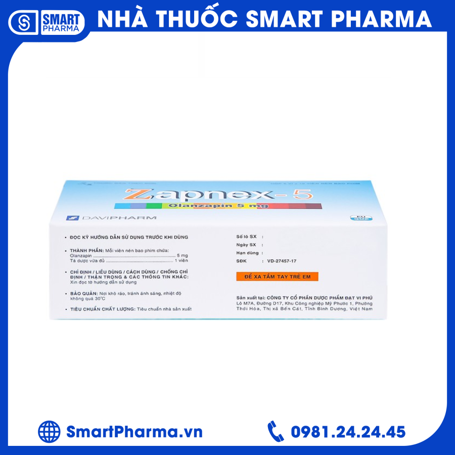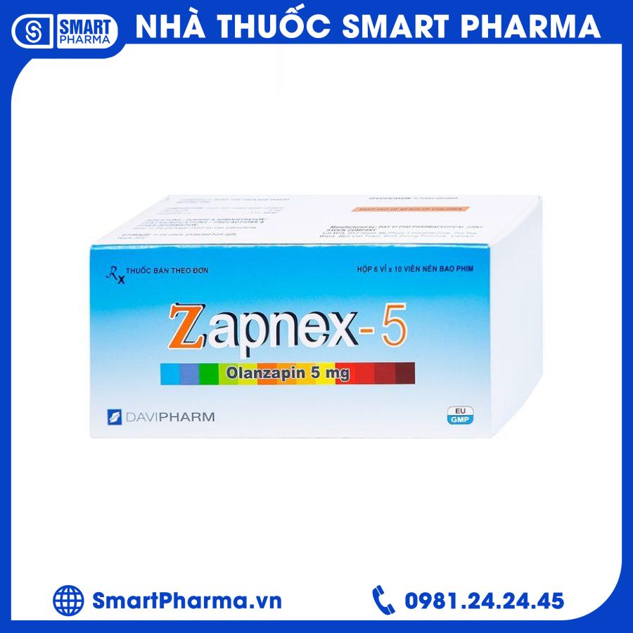 Thuốc Zapnex 5 mg được sản xuất bởi công ty cổ phần Dược phẩm Đạt Vi Phú. Zapnex 5 mg chứa hoạt chất là olanzapin, thuộc nhóm thuốc chống loạn thần.